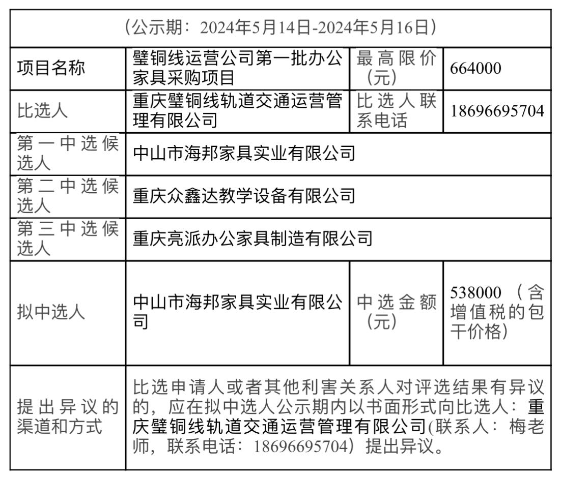 璧銅線運(yùn)營(yíng)公司第一批辦公家具采購(gòu)項(xiàng)目競(jìng)爭(zhēng)性比選結(jié)果公示表