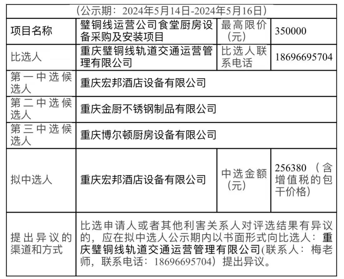 璧銅線運營公司廚房設備采購及安裝項目競爭性比選結果公示表