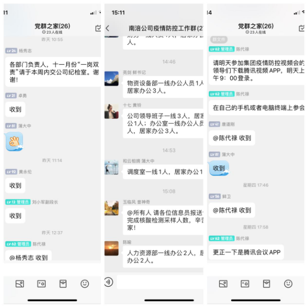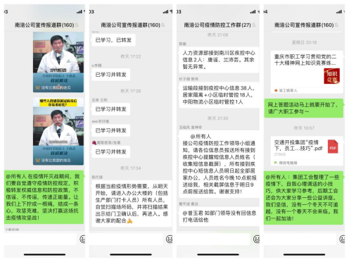 11月21日下午,臨近下班時間,南涪公司部分員工接連收到南川疾控中心短信提醒,提示因時空交集或暴露于涉疫場所,存在感染風險,要求當事人居家并配合三天三次核酸檢測。接到報告,公司疫情防控領(lǐng)導小組高度重視,立即部署,首先啟動信息收集工作,通過篩查,發(fā)現(xiàn)當日就新增居住小區(qū)臨時管控人員38人,短信提醒居家人員57人,超過公司員工總數(shù)的40%,已嚴重影響公司正常運行。守陣地,居家辦公不松懈