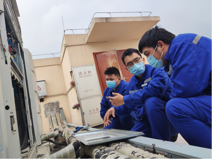 產(chǎn)業(yè)公司江跳線維管項(xiàng)目部車輛段機(jī)電工班工班長(zhǎng)、團(tuán)員青年彭成正在教工班人員空調(diào)多聯(lián)機(jī)故障處置
