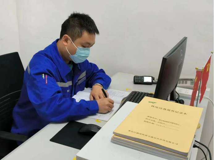 產(chǎn)業(yè)公司江跳線維管項(xiàng)目部九龍園機(jī)電工班組長(zhǎng)、團(tuán)員青年陳俊男正在填寫值班當(dāng)日機(jī)電設(shè)備巡檢記錄