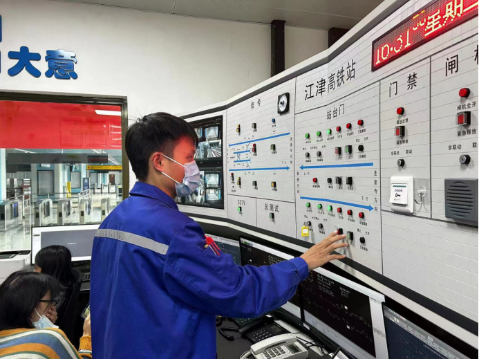 產(chǎn)業(yè)公司江跳線維管項(xiàng)目九龍園機(jī)電工班機(jī)電綜合檢修工、團(tuán)員青年葛志翔正在檢查江津高鐵站ABP盤站臺(tái)門控制功能